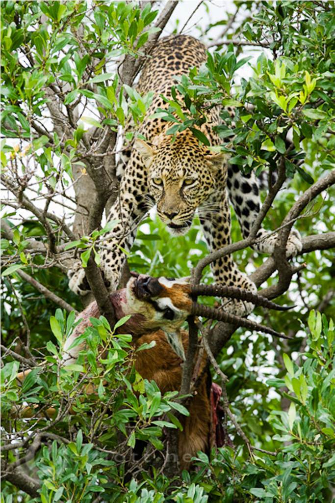 Вообще леопард лучше всех других кошачьих лазит по деревьям и убитую добычу постоянно затаскивает на ветки, делая ее недоступной для других хищников. Но сам леопард не упустит случая отнять добычу у более слабого охотника, например, гепарда.