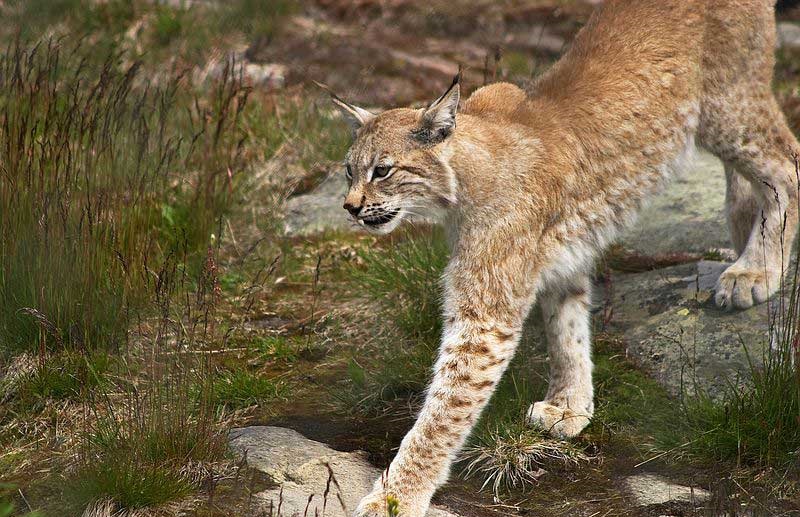 Обыкновенная рысь (лат. Lucid Lynx) — высокий, до 70 см, зверь с плотным телом длиной до 130 см. Взрослые особи весят 30 кг. Мех плотный, имеет песочный окрас с пятнами и полосами. Это позволяет зверю хорошо прятаться в лесистой местности и высокой траве.