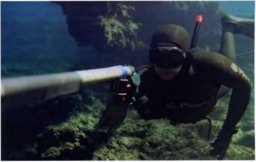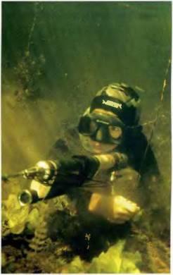 Так о чем это мы? Ах да, ружье зарядить! На берегу? В лодке? В воде? Да, конечно же, в воде, но важно при этом, чтобы и направлено оно было вниз, и в сторону противоположную той, где находятся люди и напарник (тоже представитель человечества). Если у вас пневматическое, пружинное или гидропневматическое ружье, необходима заряжалка — накладка, одеваемая на острие гарпуна, чтобы не поранить руки при заряжании (совершенно недопустимо в качестве заряжалки применять найденные на дне камень-голыш, кусок деревяшки, обломок железа и тому подобное). Я встречал одного охотника, который заряжал ружье, упирая гарпун в груз на собственном грузовом поясе! Представляете, что было бы, если б гарпун соскользнул? Заряжалка должна быть надежной и безопасной! От ее прочности и надежности зависит, в первую очередь, ваше здоровье! Важно и то, где и как вы держите заряжалку во время охоты. Крепление заряжалки на руке — ответственная задача, а ее чаще всего крепят именно на руке капроновым шнурком, и исключительно важно, чтобы она не болталась свободно! Бывали ситуации, когда охотники гибли, зацепившись свободно болтающейся заряжалкой за корягу или щель в скале, не успев достать нож, чтобы обрезать зацеп.