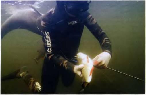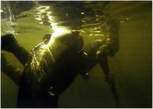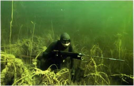 Нелишним будет напомнить и о правильном подборе веса грузпояса: ваша плавучесть должна быть нулевой на той глубине, где вы будете искать рыбу. Подберите (до начала охоты и зарядки ружья) неподалеку от берега или лодки необходимое количество грузов. Оперативно управляйте своей плавучестью, в зависимости от глубины снимая или одевая дополнительные грузы. Хороший выход — два пояса или пояс и грузовая система одновременно: на глубине вы охотитесь только с одним поясом, а выйдя на мелководье, одеваете дополнительно грузовую систему или второй пояс. Один мой знакомый, охотясь в камышах с самодельным ружьем, протаскивал его сквозь камыши. Камышинка попала под спусковую скобу, нажала на крючок — самострел под челюсть… Будьте осторожны всегда! Еще один знакомый не разрядил ружье после охоты, уложив его заряженным в багажник. В итоге самострел: стрелой пробив стенку багажника и кресло, гарпун вылез наружу! Хозяин в восторге: «Какое классное мощное ружье!» Хорошо, что никого не задело! С тех пор разряжает ружье сразу, как только решает прекратить охоту.