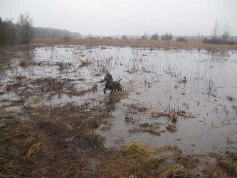ВСЕГДА на занятиях используйте длинную веревку, не давайте ни одного шанса щенку уйти с добычей в сторону, не услышать, или не выполнить подзыв к вам. Но при этом, старайтесь все делать так, чтобы занятия приносили малышу удовольствие. Но не стремитесь сильно утомлять щенка нравоучениями – лучше недоделать, чем переделать! Обучив щенка выполнять подачи с открытой воды, переходите к поискам в условиях небольших зарослей, неглубоких, но вязких мест, с наличием небольшого количества воды, грязи…