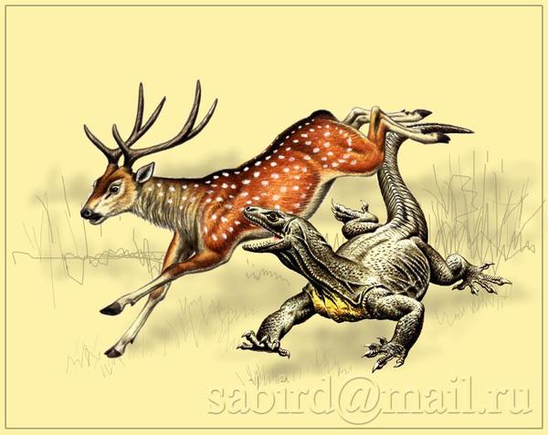 Ночью животные погружаются в крепкий сон – настолько, что в это время к ним можно спокойно приблизиться. Благодаря этой особенности хищников, ученые выяснили фантастическую подробность. Оказывается, ночной и дневной перепад температуры тела у драконов различается почти в два раза: днем они нагреваются до 40 градусов, тогда как ночью температура понижается до 20 градусов. На острове Комодо у варанов нет естественных врагов, поэтому они живут до 50 лет. Интересен и сам процесс охоты драконов: завидев стадо оленей, он медленно приближается, пока не окажется в самом центре.