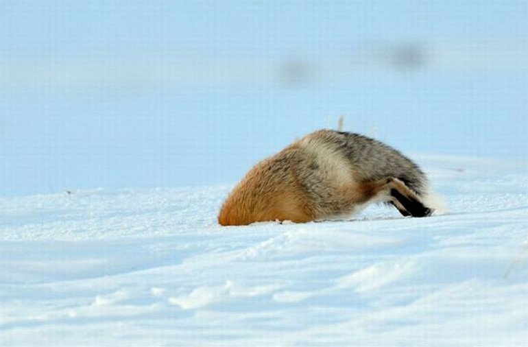 Лиса «мышкует» — охотится за мышью под толщей снега