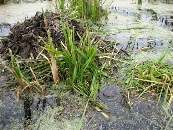 Искусственный остров сооружается очень просто, на суше срезаем кочку с травой и, проткнув ее колом, втыкаем в дно рядом с хаткой и устанавливаем капкан. Плотики, кроме того, что выполняют функции кочек, еще и служат площадкой для постройки жилища.