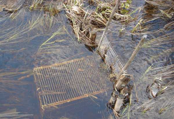 Если в водоеме уровень воды постоянно меняется, можно воспользоваться еще одним способом установки капкана. Устанавливают его на кусочек пенопласта. Плавучий материал будет подниматься или опускаться в зависимости от уровня воды. Зафиксировать пенопласт можно при помощи длинного кола или прута, который вставляется в заранее проделанное посередине отверстие. Другой конец прута втыкается в дно водоема. Капкан устанавливают под водой и привязывают к шесту металлическим тросом.