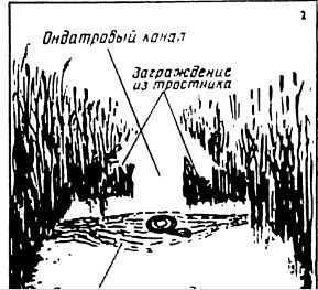 Поздней осенью, во избежание примерзания мокрого сторожка к рычагу насторожки, надо стараться поставить капканы так, чтобы тарелочка и механизм насторожки были покрыты водой. В мелких и узких ходах каналах капкан устанавливается посредине прямо на дно, в широких и приглубных каналах – на утопленную в воде кочку или пучки связанного и притопленного тростника. Важно, чтобы тарелочка капкана не находилась глубже 5 сантиметров от поверхности воды. Лишнее пространство канала перегораживается пучками растительности с таким расчетом, чтобы зверек проплыл точно под поставленным самоловом (см. рис.2).