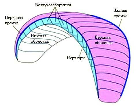 Купол имеет двойную конструкцию, которую составляют верхние и нижние полотнища. Они соединяются с поперечными составляющими купола, которые называются нервюрами. Эти элементы формируют профиль летательного аппарата. Чтобы параплан быстро наполнялся воздухом во всех отсеках, в нервюрах располагаются специальные отверстия, благодаря которым становится возможным свободное движение воздушных потоков во внутреннем пространстве крыла.