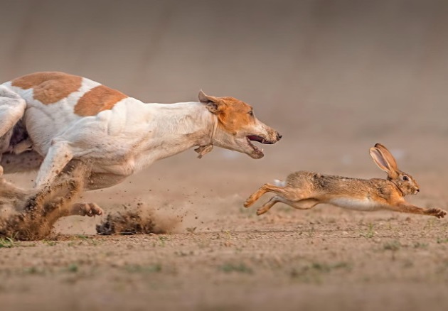 Подняв добычу с лёжки, надо быть в полной готовности к выстрелу. Следует учитывать местные особенности вида – лесной заяц постарается уйти в лес по просеке, дороге, тропинке. Полевой русак пойдёт на открытое место широкой дугой. Стрельба в угон требует знания некоторых особенностей – зверька отпускают на некоторое расстояние, чтобы не разбить выстрелом, для точного попадания прицеливаются поверх ушей. При коротком подходе первые прыжки заяц совершает часто зигзагообразно, а лишь затем устремляется прямо. Это также причина для того, чтобы несколько увеличить дистанцию перед выстрелом.
