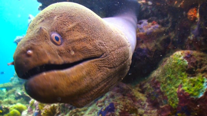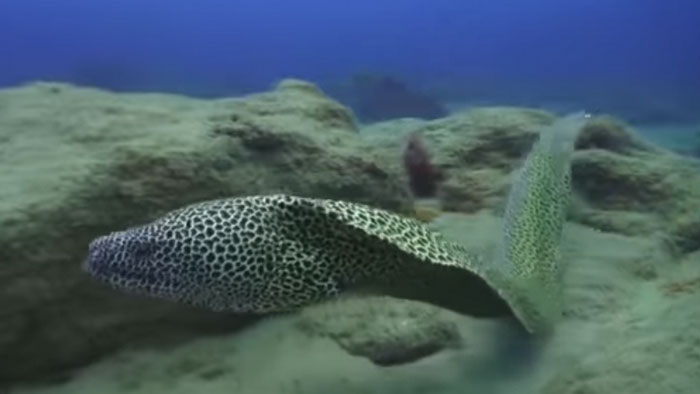 Чтобы уловить «запах» добычи в воде, мурена широко разевает пасть и плывёт, пропуская сквозь себя потоки воды.