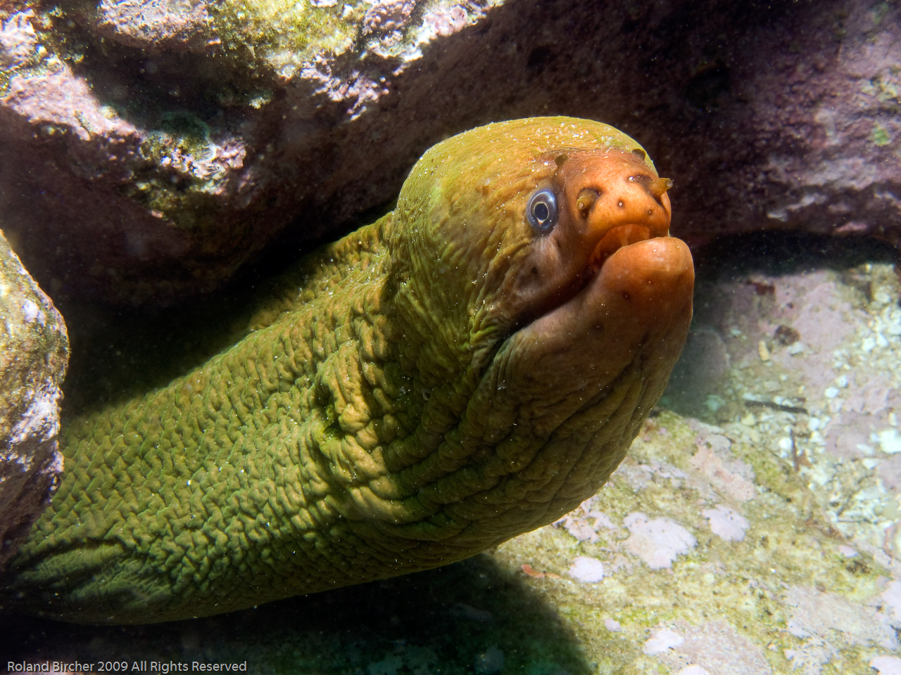 Мурен можно описать так: тело крепкое, змеевидное, жаберные отверстия маленькие и круглые. На фото ниже зелёная мурена и у неё чётко виден маленький круг жаберного отверстия.