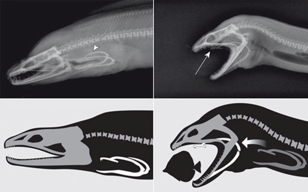 Во время охоты задняя челюсть располагается глубоко в глотке, но стоит добыче оказаться близко к пасти мурены, как она придвигается практически вплотную к передним. Ее основное предназначение — проталкивать еду в пищевод и размельчать ее. Согласитесь, вряд ли добыче удастся вырваться из этого двойного «капкана».