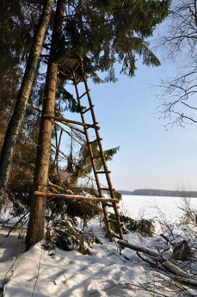 Лестница так же, как и лабаз, устанавливается у тропы, по которой должен пойти хищник, на расстоянии около 150 м с подветренной стороны, чтобы волк не почувствовал охотника. На данном расстоянии от привады зверь ведет себя менее осторожно, что и нужно охотнику.