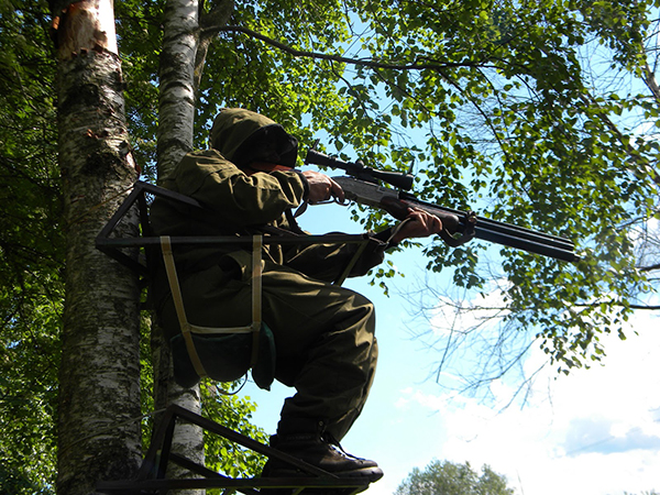 Ногам охотника ни в коем случае нельзя находиться в воздухе или быть слишком высоко поднятыми. При правильном расположении на лестнице ноги удобно опираются на поперечину. Не стоит забывать про спину сидящего человека - под нее делается специальная поперечина, имеющая длину не менее 1,5 м.