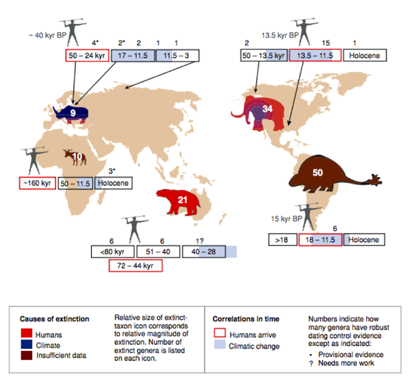 Современные люди, входящие в Европу и Азию, делают подобные вещи. Эта новая форма агрессивной охоты и совместной охоты в конечном итоге приведет к исчезновению большинства крупных млекопитающих (мегафауны) во всем мире. Мы продолжаем делать это до сегодняшнего дня (Слоны и Носороги являются последним из этих массивных видов, которые когда-то ходили по земле).