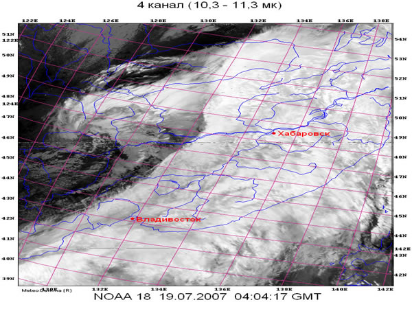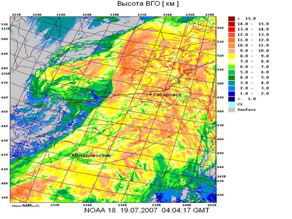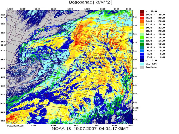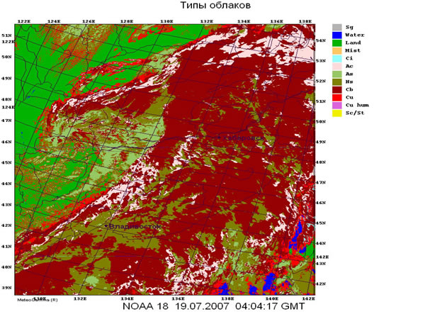 С помощью программного комплекса METEOGAMMA , на основе спутниковой цифровой информации HRPT со спутников серии NOAA, были рассчитаны гидродинамические параметры облаков (температура, высота верхней границы, водозапас, толщина и др.), а также классифицированы по ярусам и морфологии типы облачности. С помощью этих снимков была более детально рассмотрена структура облачных образований, выявлены зоны с максимальными осадками, которые характерны для мощных кучево-дождевых облаков. Это позволило спрогнозировать сильные дожди в Приморском крае и своевременно передать заинтересованным организациям предупреждение о резком ухудшении погоды.