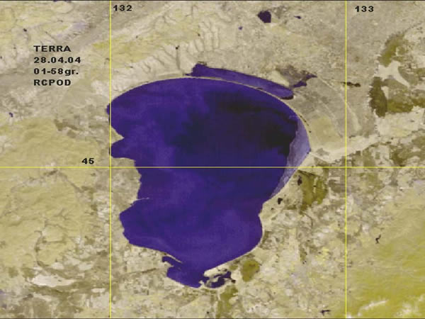 Оценка состояния ледового покрова на озере Ханка в апреле 2004 года, на основе спутниковой информации спектрорадиометра MODIS со спутников Terra и Aqua. 9.04.04. – озеро полностью покрыто льдом. 20.04.04 – 20% озера покрыто льдом. 28.04.04 – озеро полностью очистилось ото льда.