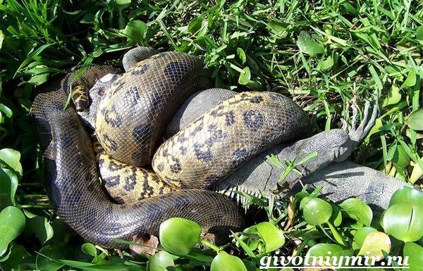 Сначала долго подстерегает свою добычу, затаившись среди прибрежных зарослей, потом следует резкий рывок и тут же на беднягу наматываются кольца, которые сжимают тело жертвы с необыкновенной силой.