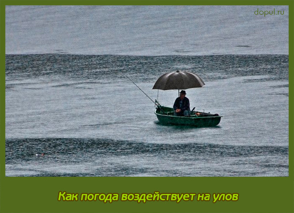 Между рыбаками ходят разговоры о том, что дождь положительно повлияет на улов. Это, отчасти, правда, ведь не каждый дождь способен изменить улов. Если на улице очень жарко, небольшой дождь и вправду поспособствует большому улову, так как температура воды снизится, что немного «расслабит» водных обитателей и заставит их искать себе еду.