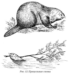 Кстати, манера стрельбы может быть различной. Так, многие специалисты склонны выделять стрельбу с поводом и навскидку. Если вскидывать ружье, догонять стволами плывущего бобра, перегонять его, давая упреждение, и стрелять, то это выстрел с поводом. Если же при вскидывании ружья стволы сразу оказываются несколько впереди зверя, то это стрельба навскидку. Первый способ проще, так как имеется хотя бы некоторое время на то, чтобы обдумать свои действия, а вот для стрельбы навскидку реакция должна быть просто молниеносной. «Зачем все эти тонкости и премудрости? Мы будем плыть на лодке по протоке и все время держать ружье наготове!» Попробуйте для начала сесть на стул посередине комнаты, прицелиться в телевизор и посидеть 10–15 мин. У любого, даже опытного стрелка задрожат руки, непомерно тяжелым покажется ружье! А в лодке придется сидеть так гораздо дольше.