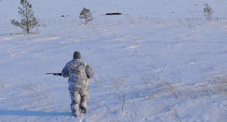 У охотника должно быть легкое, не стесняющее движений снаряжение. Любая ненужная вещь может спугнуть зверя. Дополнительные вещи можно оставить на краю поля или в машине. Если много снега, необходимо надевать белый маскирующий халат.