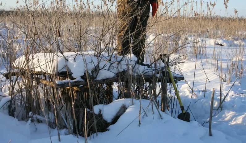 Чтобы приманку не засыпало снегом, ее укрывают чем-то вроде шалашика . В зависимости от места его делают из стеблей камыша, еловых и сосновых веток, переплетенных веток кустов и т.п.