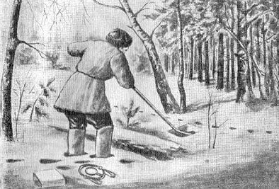 Землянка копается заранее, еще по теплу. Глубиной в рост человека, с небольшим окошком. Пол утепляется опилками или листвой, устраивается сидение для отдыха. Снаружи землянка не должна быть заметна.