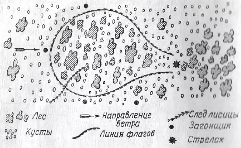 На лису можно охотиться и загонным способом, огораживая прочёсываемую территорию флажками. Такая охота особенно действенна в населенных местах, где лиса привычна к человеку. Кроме всего прочего это коллективная охота, помогающая собирать хорошие компании.