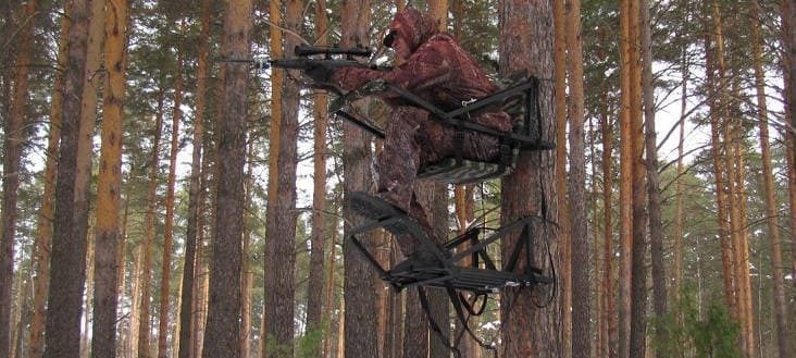 Конечно сидение в лабазе намного холоднее землянки, и в сильный мороз там не посидишь. Но отличный обзор сверху и скрытность перекрывают эти неудобства. При маскировке на дереве выбирают одежду темных тонов.