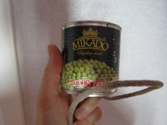 На следующем этапе изготовления вабы, нам нужно в центре дна выбранной банки проделать небольшое отверстие, диаметр которого должен соответствовать диаметру капроновой нитки, которую нужно продеть через отверстие завязав в узел ее конец. В принципе, наша ваба готова, но ее еще можно дополнительно улучшить, чтобы пропал металлический звук. Для этого банку следует обернуть кожей и прижать изолентой.