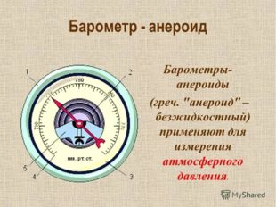 Барометр От греч.Baros - тяжесть + Metreo - измеряю Барометр - прибор для измерения атмосферного давления. Барометры подразделяются на жидкостные барометры и барометры-анероиды.