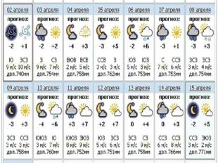 Температура воздуха ещё долго будет оставаться такой же как в ночные, так и в утренние часы. Лишь днём температура воздуха начнёт прогреваться до 0 градусов. Ожидаются осадки в виде мокрого дождя переходящего в снег. Местами гололёд. Температура воздуха достигает + 30 градусов. Погода переменная. Ветер южный с переходом на северо- западный, 3-8 м/ сек с усилением во второй половине дня.