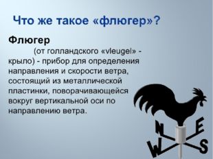 Флюгер - прибор, показывающий направление ветра. Анемометр - прибор, показывающий скорость ветра.