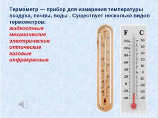 Термометр Прибор для измерения температуры воздуха, почвы, воды и так далее. Записывается так: 20 C