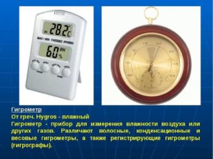 Гигрометр От греч. Hygros - влажный Гигрометр - прибор для измерения влажности воздуха или других газов. Различают волосные, конденсационные и весовые гигрометры, а также регистрирующие гигрометры (гигрографы).