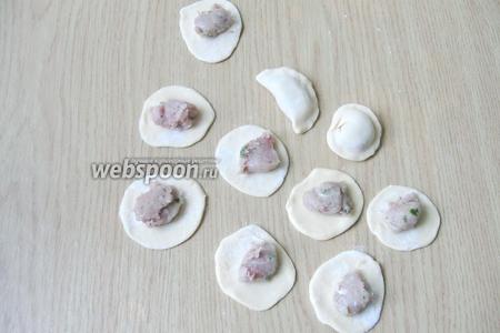 В каждый кружок кладем чайную ложку мясного фарша. Сначала кружок с фаршем защипываем, как вареник. А затем соединяем концы. Получается пельмень.
