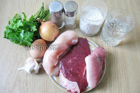 Для приготовления уральских пельменей потребуются такие продукты: мякоть говядины, мякоть свинины, филе куриное, лук репчатый, чеснок, соль, перец чёрный молотый, петрушка, мука, яйцо куриное, вода.