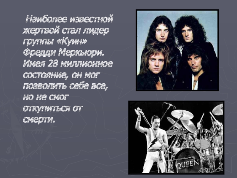 Наиболее известной жертвой стал лидер группы «Куин» Фредди Меркьюри. Имея 28 миллионное состояние, он мог позволить себе все, но не смог откупиться от смерти.