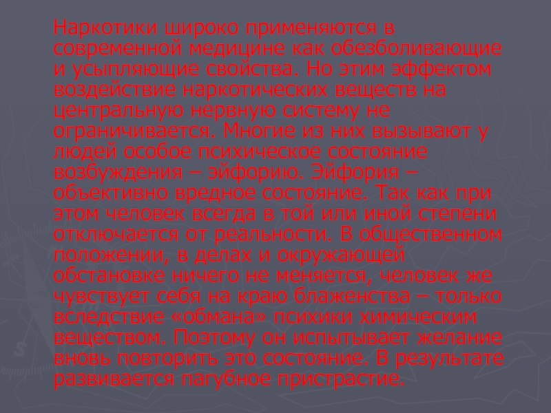 Наркотики широко применяются в современной медицине как обезболивающие и усыпляющие свойства. Но этим эффектом воздействие наркотических веществ на центральную нервную систему не ограничивается. Многие из них вызывают у людей особое психическое состояние возбуждения – эйфорию. Эйфория – объективно вредное состояние. Так как при этом человек всегда в той или иной степени отключается от реальности. В общественном положении, в делах и окружающей обстановке ничего не меняется, человек же чувствует себя на краю блаженства – только вследствие «обмана» психики химическим веществом. Поэтому он испытывает желание вновь повторить это состояние. В результате развивается пагубное пристрастие.