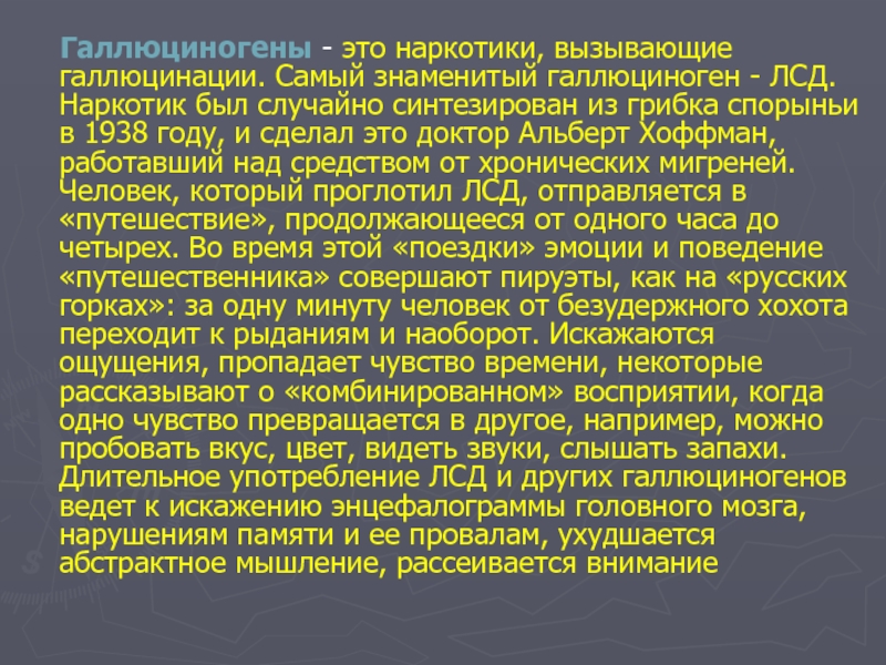 Галлюциногены - это наркотики, вызывающие галлюцинации. Самый знаменитый галлюциноген - ЛСД. Наркотик был случайно синтезирован из грибка спорыньи в 1938 году, и сделал это доктор Альберт Хоффман, работавший над средством от хронических мигреней. Человек, который проглотил ЛСД, отправляется в «путешествие», продолжающееся от одного часа до четырех. Во время этой «поездки» эмоции и поведение «путешественника» совершают пируэты, как на «русских горках»: за одну минуту человек от безудержного хохота переходит к рыданиям и наоборот. Искажаются ощущения, пропадает чувство времени, некоторые рассказывают о «комбинированном» восприятии, когда одно чувство превращается в другое, например, можно пробовать вкус, цвет, видеть звуки, слышать запахи. Длительное употребление ЛСД и других галлюциногенов ведет к искажению энцефалограммы головного мозга, нарушениям памяти и ее провалам, ухудшается абстрактное мышление, рассеивается внимание