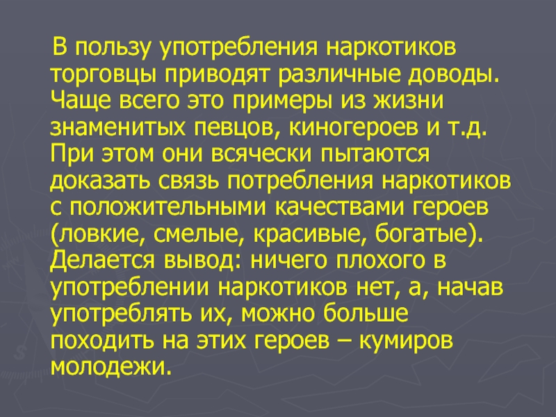 В пользу употребления наркотиков торговцы приводят различные доводы. Чаще всего это примеры из жизни знаменитых певцов, киногероев и т.д. При этом они всячески пытаются доказать связь потребления наркотиков с положительными качествами героев (ловкие, смелые, красивые, богатые). Делается вывод: ничего плохого в употреблении наркотиков нет, а, начав употреблять их, можно больше походить на этих героев – кумиров молодежи.