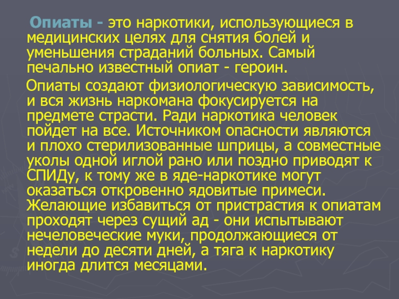 Опиаты - это наркотики, использующиеся в медицинских целях для снятия болей и уменьшения страданий больных. Самый печально известный опиат - героин.