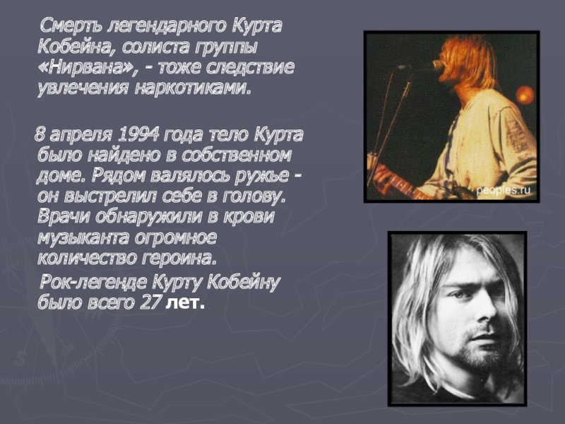 Смерть легендарного Курта Кобейна, солиста группы «Нирвана», - тоже следствие увлечения наркотиками.