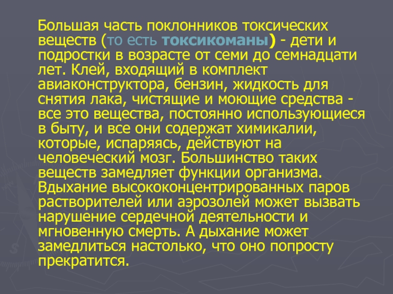 Большая часть поклонников токсических веществ (то есть токсикоманы) - дети и подростки в возрасте от семи до семнадцати лет. Клей, входящий в комплект авиаконструктора, бензин, жидкость для снятия лака, чистящие и моющие средства - все это вещества, постоянно использующиеся в быту, и все они содержат химикалии, которые, испаряясь, действуют на человеческий мозг. Большинство таких веществ замедляет функции организма. Вдыхание высококонцентрированных паров растворителей или аэрозолей может вызвать нарушение сердечной деятельности и мгновенную смерть. А дыхание может замедлиться настолько, что оно попросту прекратится.