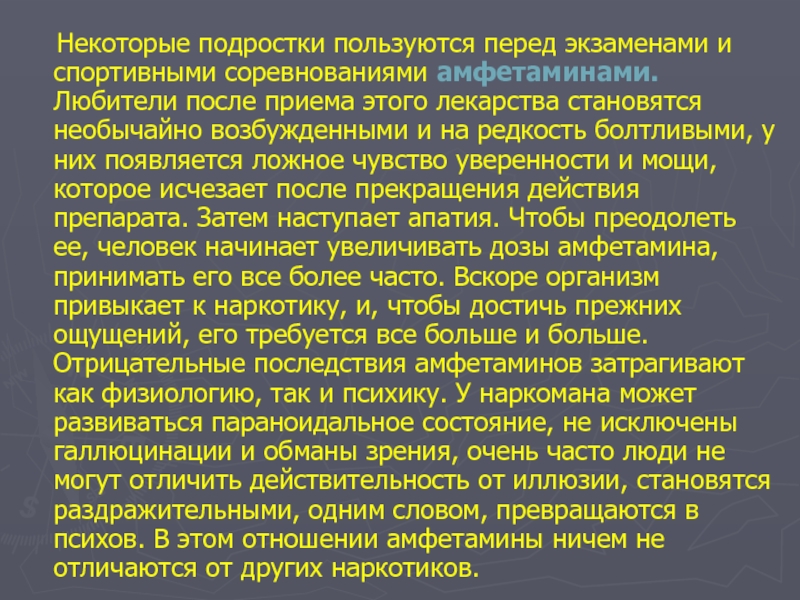 Некоторые подростки пользуются перед экзаменами и спортивными соревнованиями амфетаминами. Любители после приема этого лекарства становятся необычайно возбужденными и на редкость болтливыми, у них появляется ложное чувство уверенности и мощи, которое исчезает после прекращения действия препарата. Затем наступает апатия. Чтобы преодолеть ее, человек начинает увеличивать дозы амфетамина, принимать его все более часто. Вскоре организм привыкает к наркотику, и, чтобы достичь прежних ощущений, его требуется все больше и больше. Отрицательные последствия амфетаминов затрагивают как физиологию, так и психику. У наркомана может развиваться параноидальное состояние, не исключены галлюцинации и обманы зрения, очень часто люди не могут отличить действительность от иллюзии, становятся раздражительными, одним словом, превращаются в психов. В этом отношении амфетамины ничем не отличаются от других наркотиков.