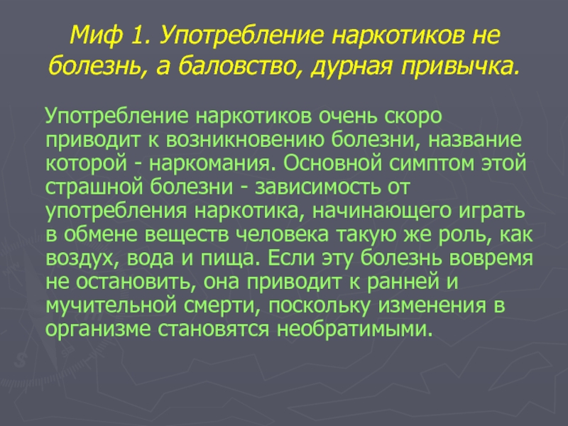 Миф 1. Употребление наркотиков не болезнь, а баловство, дурная привычка.