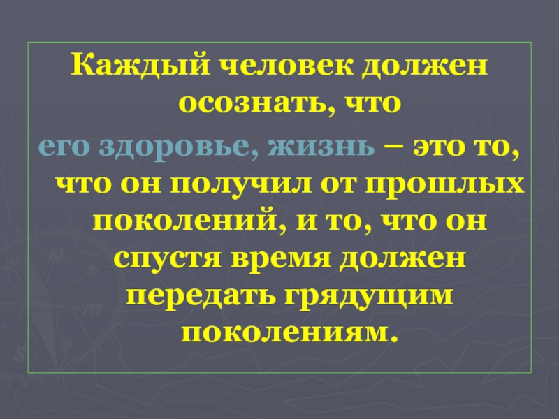 его здоровье, жизнь – это то, что он получил от прошлых поколений, и то, что он спустя время должен передать грядущим поколениям.