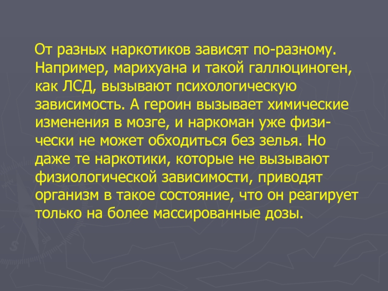 От разных наркотиков зависят по-разному. Например, марихуана и такой галлюциноген, как ЛСД, вызывают психологическую зависимость. А героин вызывает химические изменения в мозге, и наркоман уже физически не может обходиться без зелья. Но даже те наркотики, которые не вызывают физиологической зависимости, приводят организм в такое состояние, что он реагирует только на более массированные дозы.