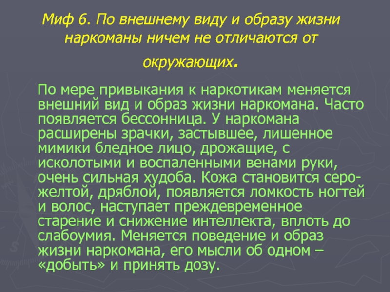 Миф 6. По внешнему виду и образу жизни наркоманы ничем не отличаются от окружающих.