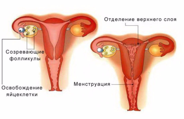 Если оплодотворения не произошло, уровень прогестеронов начинает постепенно уменьшаться, а матка приходит в свое нормальное состояние, отторгая утолщенную оболочку. Именно процесс отторжения отмершего эндометрия, сопровождаемого кровянистыми выделениями, называют менструацией.