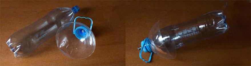 Суть подобной конструкции такова. Крышки от 2-х литровой и 5-литровой бутылки имеют разный диаметр. Нужно просверлить их точно по центру и соединить болтом и гайками. Крышки нужно вставить одна в другую так, чтобы они были с одной стороны. Затем нужно обрезать 5-литровую бутылку, а в 2-литровой сделать отверстие диаметром приблизительно 1 см.